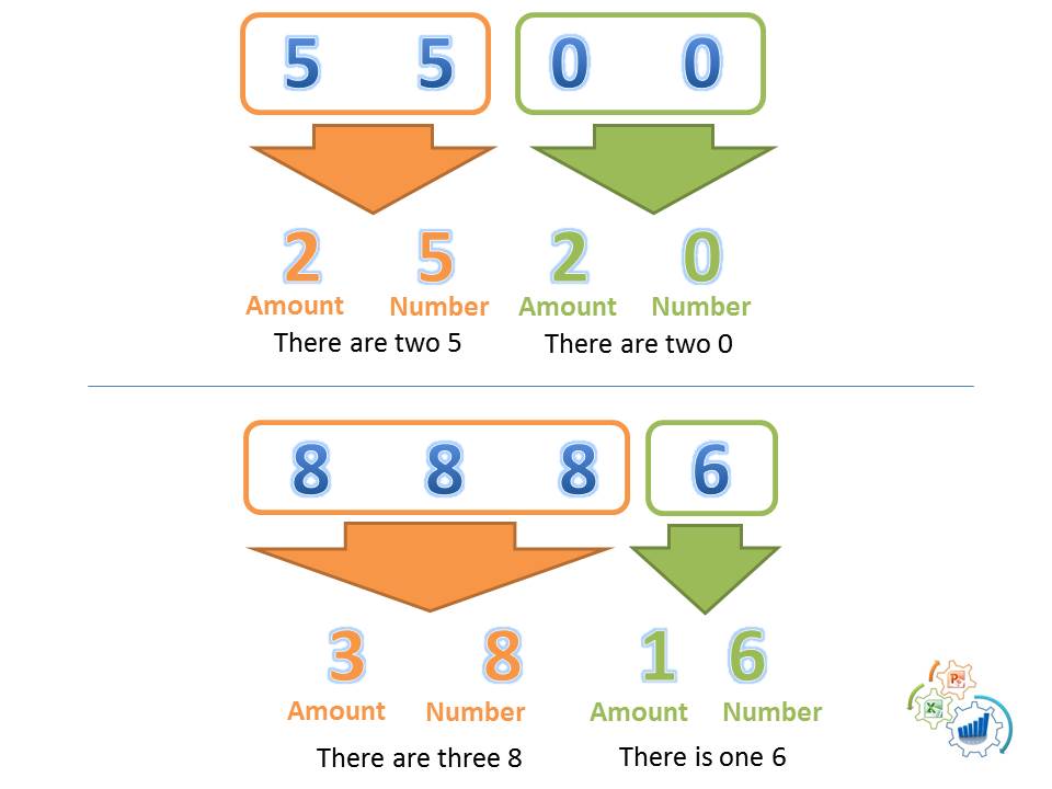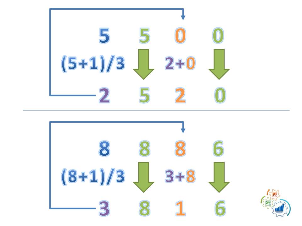 - ตัวเลขรหัสจริงหลักแรกเกิดจาก นำตัวเลขรหัสใบ้หลักแรกบวกด้วยหนึ่ง แล้วหารด้วยสาม (5+1)/3 = 2 เลข 2 จึงเป็นตัวเลขรหัสจริงหลักแรก