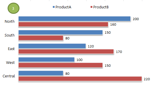 ถ้าต้องการนำเสนอประเด็นเรื่อง ‘การเปรียบเทียบ’ ยอดขาย ภายหลังออกโปรโมชั่นสินค้า B ยอดขายพื้นที่ภาคตะวันออก ตะวันตก และใต้ ของสินค้า B เหนือกว่าสินค้า A กราฟแบบที่ 3 อาจเป็นคำตอบที่ถูกต้องก็ได้