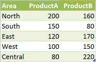 สมมติมีข้อมูลยอดขายของสินค้า A และ B แบ่งตามพื้นที่ขาย แสดงในรูปแบบตารางดังนี้