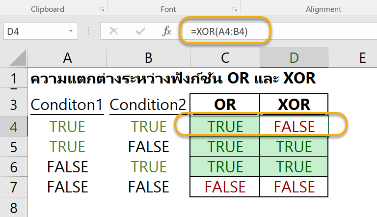 เพื่ออธิบายให้เห็นภาพ พอดีผมเจอตัวอย่างการใช้งาน XOR ที่ดีมากจากเว็บ https://www.ablebits.com/office-addins-blog/2014/12/17/excel-and-or-xor-not-functions/#excel-xor-function ขออนุญาตใช้ตัวอย่างนี้อธิบายเป็นภาษาไทยนะครับ