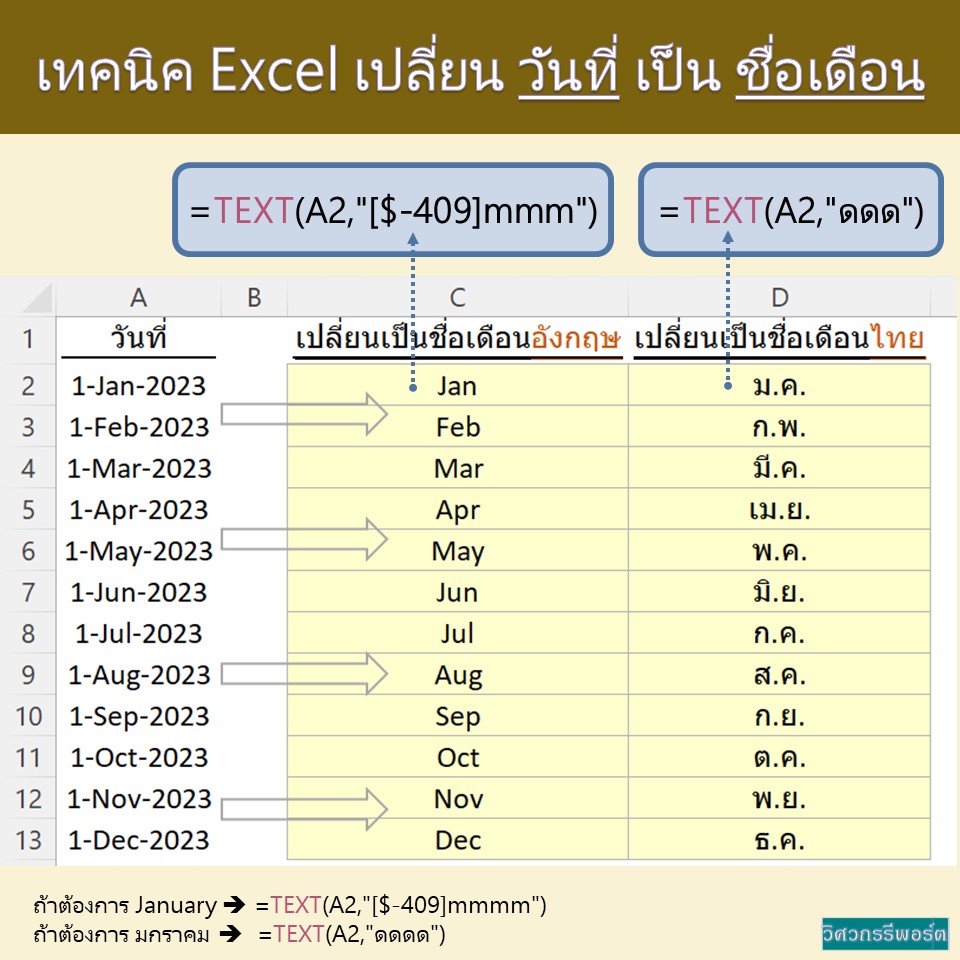 เทคนิค Excel เปลี่ยนวันที่ เป็นชื่อเดือน