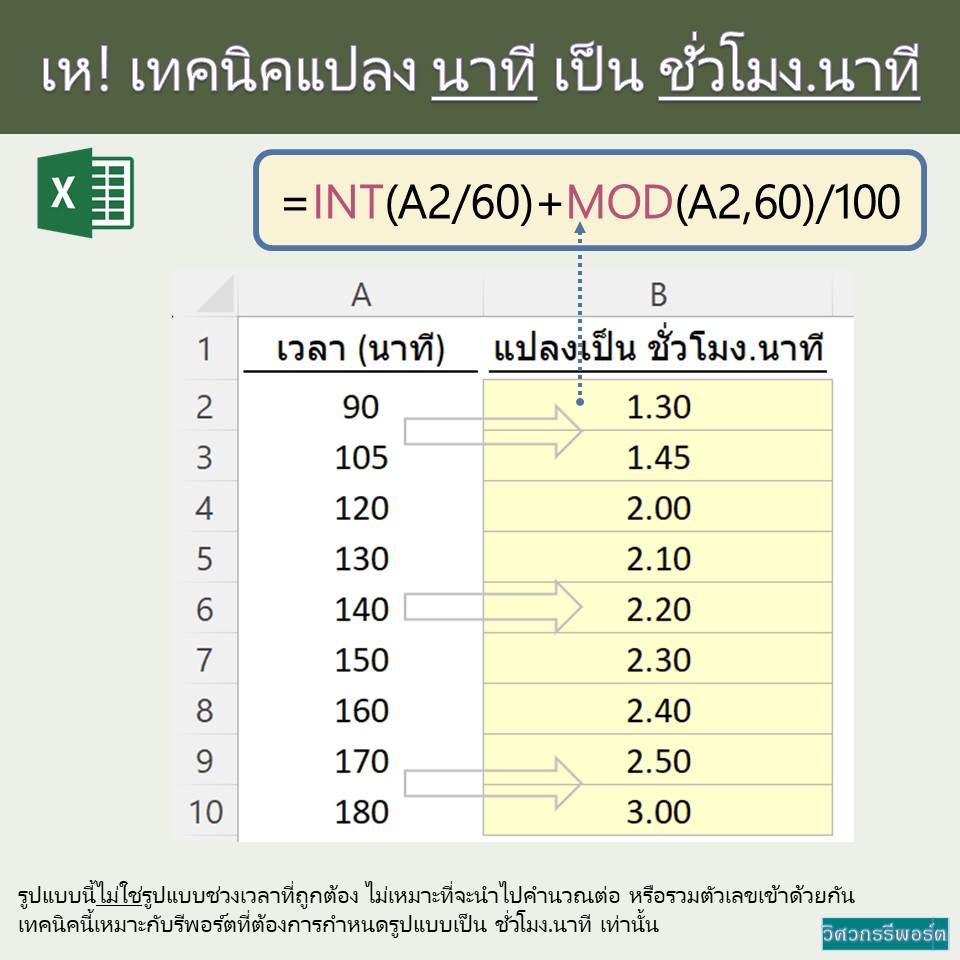 คำตอบคือ =INT(A2/60)+MOD(A2,60)/100