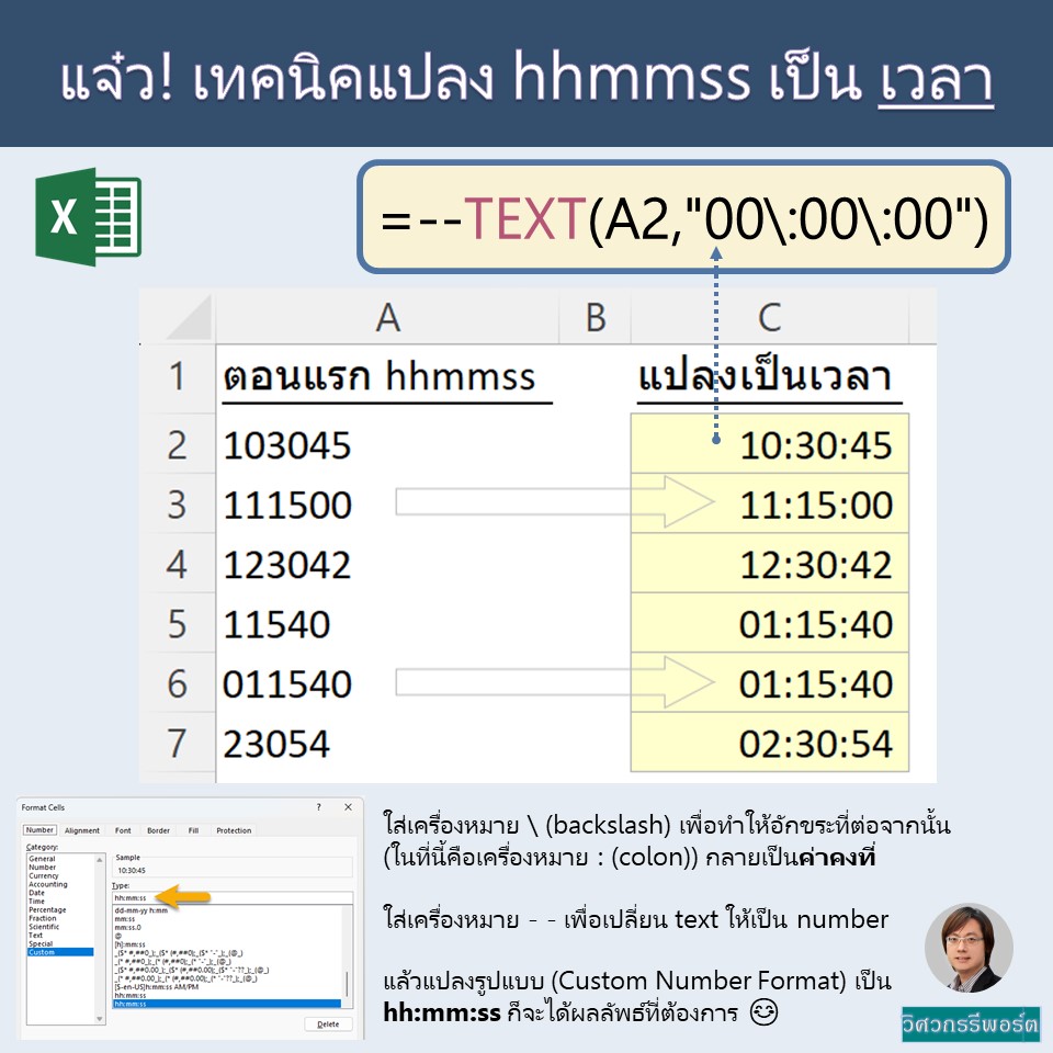 ถ้าไม่ใส่เครื่องหมาย \ (backslash) นำหน้า ฟังก์ชัน TEXT จะมองว่าอักขระนั้นเป็นรูปแบบแบบหนึ่ง ซึ่งในที่นี้ : (colon) ไม่ใช่รูปแบบที่ฟังก์ชัน TEXT รู้จัก ผลลัพธ์จะกลายเป็น #VALUE!
